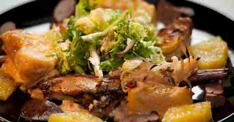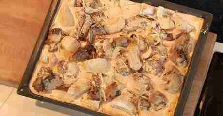 Посыпаем зайца смесью лука и тимьяна, затем цедрой. Выкладываем на противень к зайцу яблоки в крахмале.