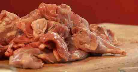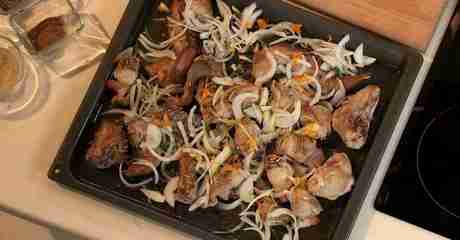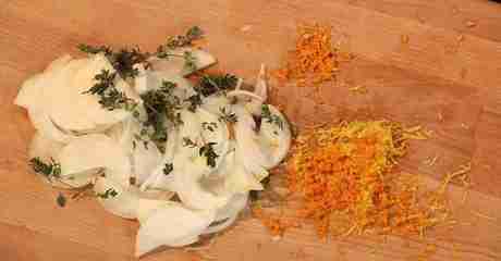 Чистим и нарезаем белый репчатый лук. Посыпаем листьями тимьяна. Снимаем с лимона и апельсина цедру. Снимаем с противня печень зайца.