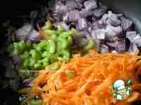 Мелко нарежьте лук (сразу присолите), сельдерей и перчик чили, натрите морковь. Выложите все вместе в кастрюльку с толстым дном с