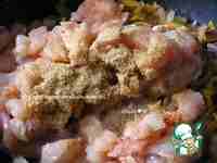 Добавьте подготовленную индейку, щедро посыпьте карри, перемешайте, обжарьте все вместе.