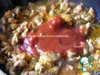 Затем влейте измельченные томаты в собственном соку или томатное пюре.
