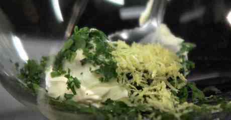 Приготовим масло. Соединяем в миске кусок сливочного масла с измельчённой петрушкой и добавляем щепотку соли. Снимаем лимонную цедру,