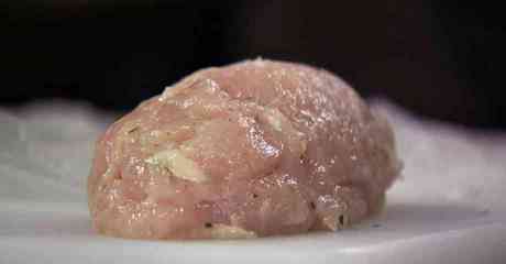 Отрезаем от куриного филе самую толстую часть, отрезаем малое филе. Отбиваем оба филе через плёнку плоской стороной молотка,