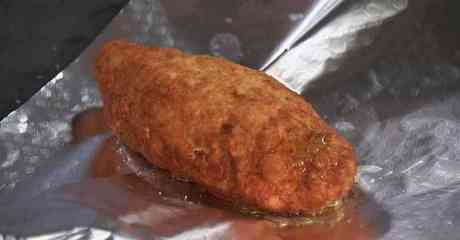 Тщательно разогреваем 1/2 стакана растительного масла. Обжариваем котлету во фритюре до золотистого цвета, затем отправляем котлету в