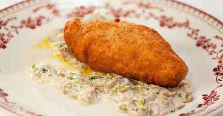 Для льезона перемешиваем яйцо с водой и добавляем 2 ст. л. муки. Обваливаем котлету в муке, опускаем в льезон, панируем в сухарях,