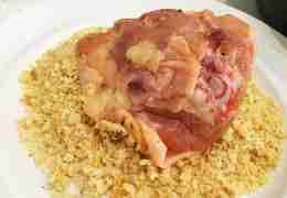 Панировочные сухари насыпаю в тарелочку. Хорошенько обсыпаю сухарями каждый кусочек курицы. Полностью, со всех сторон.