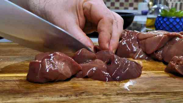 Куриную печень промываем и режем на небольшие кусочки. Вымачивать ее ни в чем не нужно.
