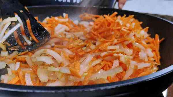 Далее выкладываем на сковороду, на то же самое масло от печени, лук и морковь. Лук режем полукольцами, морковь трем на крупной терке.