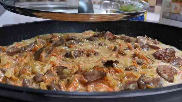 Затем выкладываем в сковороду печень, перемешиваем, закрываем крышкой и тушим ровно 5 минут. Огонь делаем ниже среднего.