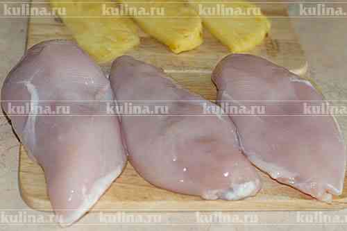 Куриное филе вымыть. Ананас очистить от кожицы и разрезать пополам.
