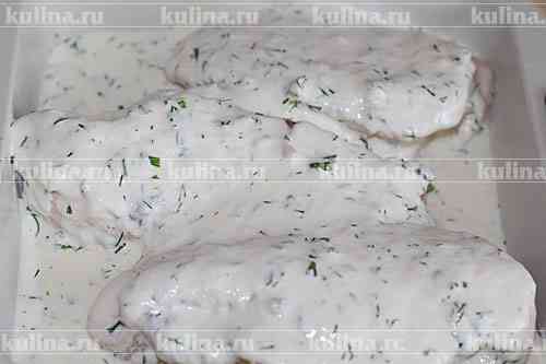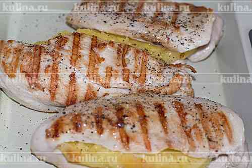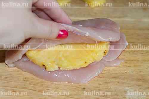 В каждом филе сделать разрез-кармашек, не прорезая филе до конца. Положить внутрь ананас.