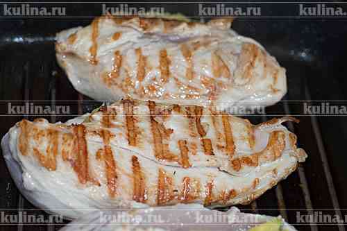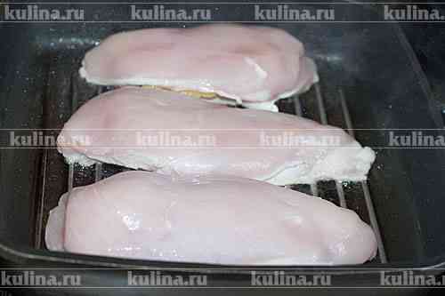 Разогреть сковороду-гриль, смазать маслом. Положить куриные грудки.
