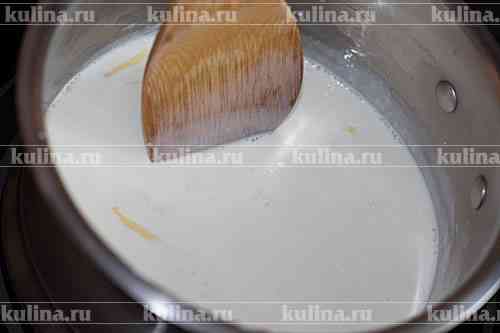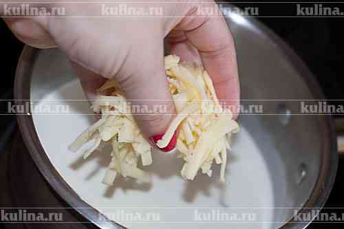 В сотейник налить сливки, разогреть, всыпать тертый сыр.