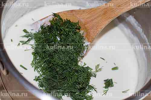 Нарезать мелко зелень укропа и смешать со сливочным соусом.