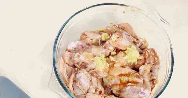 Выкладываем крылья в миску. Добавляем туда соевый соус, щепотку сахара, натертый имбирь и чеснок, чуть-чуть жгучего перца и немного