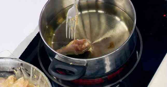 В кастрюлю наливаем достаточное количество растительного масла для фритюра. Пока оно греется, подготавливаем крылья.