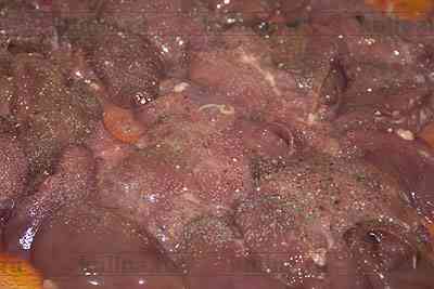 Печень помыть, обсушить, посолить и поперчить по вкусу.