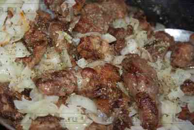 Когда печенка будет почти готова посыпать ее сушеными травками тимьяна и майорана, перемешать.