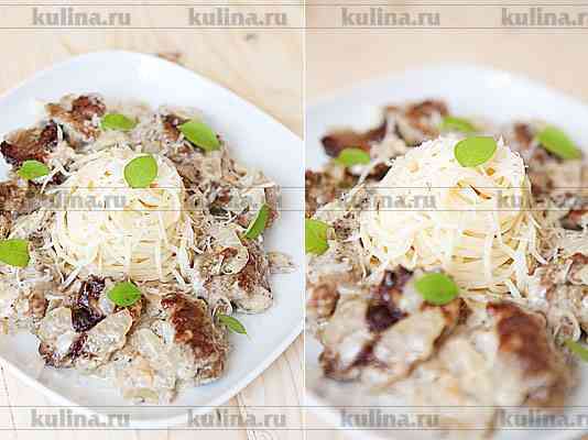 Выложить печенку на блюдо, посыпать тертым сыром, украсить листиками базилика. Подавать со спагетти, рисом или картофельным пюре.