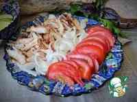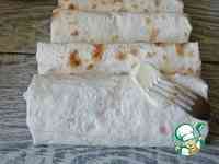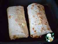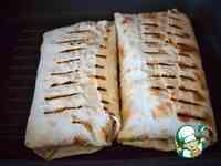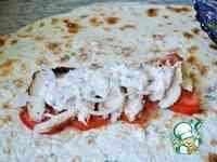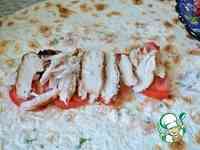 Лаваш нарезать квадратами, слегка смазать соусом (кисточкой). Выложить полоску помидоров, на них курицу.