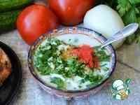 Приготовить соус, для этого смешать йогурт, кефир, рубленую петрушку с чесноком, ароматную соль и паприку. Именно, густой йогурт и кефир,
