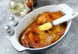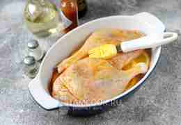На слой апельсинов положите утиные ножки, слегка посолите их и поперчите, смажьте приготовленным соусом. Отправьте форму в предварительно разогретую до