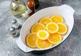 Нарежьте второй апельсин тонкими слайсами, выложите их на дно формы для запекания.