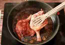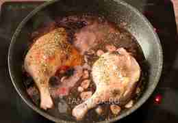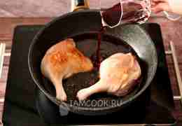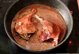 Периодически переворачивайте утиные ножки с бочка на бочок, чтобы они пропитались винным соусом со всех сторон.