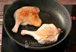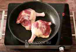 Раскалите сковороду без масла на максимальном огне. Выложите на раскалённую сковороду утиные ножки кожей вниз.