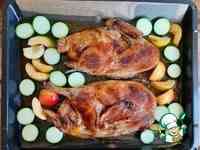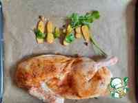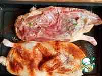 всё это уложить половины утки, посолить, поперчить и посыпать красной паприкой. Здесь можно ваши любимые приправы, нам вполне хватило этих.