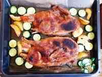 на имбирь положить половину утки шкурой наверх, рядом так же положить вторую часть