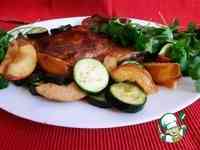 На этом этапе можно добавить овощи. Я нарезала один цукини шайбами, одно яблоко и одну айву дольками. Это не обязательно, мне так