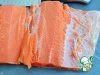 Выложить рыбу кожей вниз, надсечь до кожи на порции, смазать чесночно-масляной смесью.
