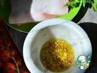 Припорошить рубленой зеленью, выложить шайбы чеснока, разложить черри. Отправить в духовку. P.S.: чтобы стеклянная или керамическая