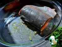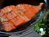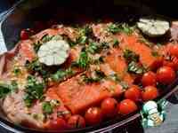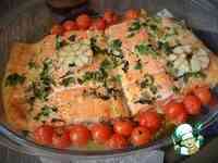 Запекать 10-15 минут, 200° C. Смазать образовавшимся соком и запекать ещё 10 минут, 220°-230° C. Подать рыбу горячей.