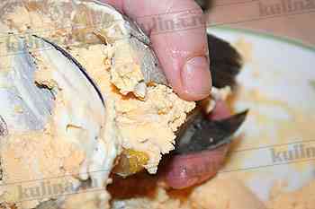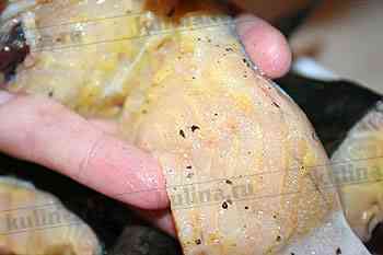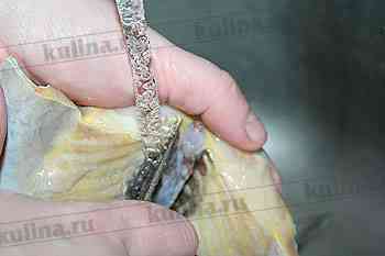 Затем рыбу опустить в кипяток на 3-5 минут, удалить чешую, костяные жучки с боков и спинки, выпотрошить и вымыть под струей воды.