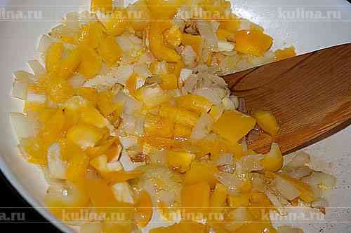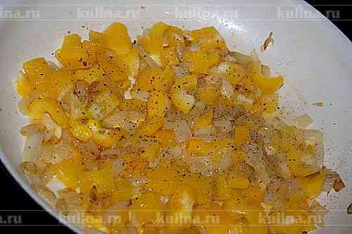 Перец нарезать и положить к луку, продолжая обжаривать овощи.