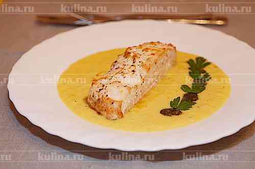 На блюдо налить соус, положить кусок рыбы, украсить соусом песто и листьями петрушки. Подать к столу, приятного аппетита!