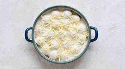 Положите фрикадельки в форму для запекания, залейте соусом, посыпьте тертым сыром и поставьте в верхнюю треть духовки