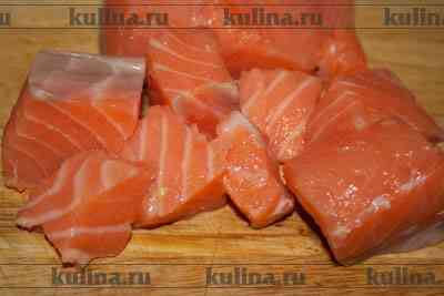 Семгу помыть, обсушить и нарезать крупными кубиками.