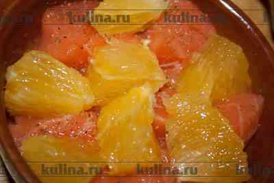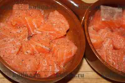 Формы для запекания смазать маслом, выложить кусочки рыбы, посолить и поперчить.