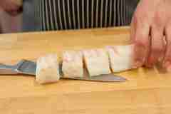 Филе рыбы вымойте и обсушите бумажным полотенцем. Затем разрежьте на более мелкие порции и замаринуйте.