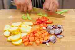 Нарежьте все овощи: морковь и цуккини нарежьте полукольцами, перец и лук — небольшими кусочками,