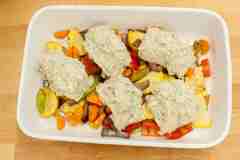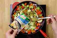 Обжарьте овощи в течение 2–3 минут на разогретой сковороде с оливковым маслом, приправьте приправой. Переложите все в жаростойкую посуду.