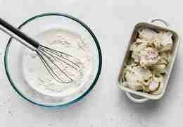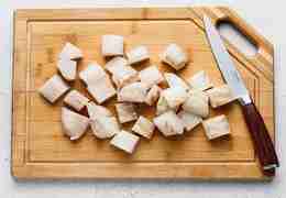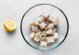 Если вы приобрели замороженное филе трески, перед приготовлением блюда поместите его в холодильник на 6–8 часов: так оно лучше сохранит сочность. После того как рыба оттает, нарежьте ее крупными кубиками.