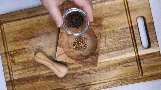 Толчем в ступке кориандр и черный перец горошком. Так ароматнее, чем брать уже размолотые специи.