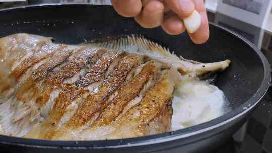 Держим чеснок в расплавленном масле 1 минуту. Затем выключаем огонь и поливаем ароматным чесночным маслом рыбу по надрезам.