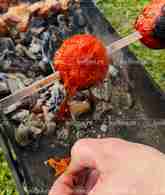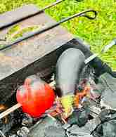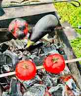 Жарить до мягкости, периодически переворачивая шампур. Баклажан и перец насадить на шампур.