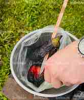 Готовый перец и баклажан переложить в пакет. Дать овощам полежать 5 минут.