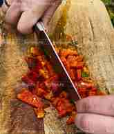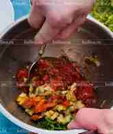 Перец, баклажан и помидоры нарезать мелкими кубиками, переложить в миску.